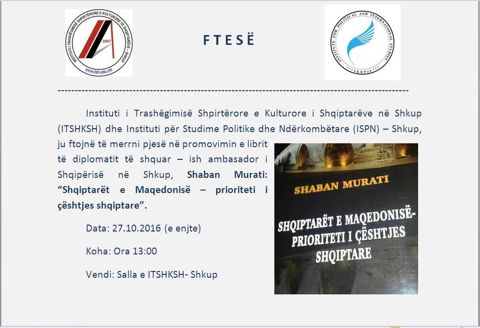 Ftesë për promovimin e librit të ish-ambasadorit Murati 25. October, 2016 Aktuale, Headlines 10,315 Shikime Shperndaje Facebook Twitter Google + LinkedIn