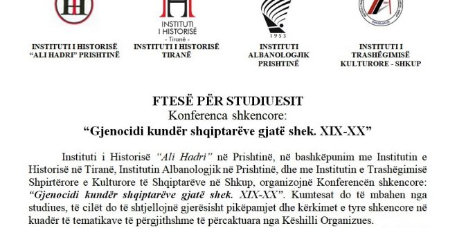 Instituti i Historisë “Ali Hadri” në Prishtinë, në bashkëpunim me Institutin e Historisë në Tiranë, Institutin Albanologjik në Prishtinë, dhe me Institutin e Trashëgimisë Shpirtërore e Kulturore të Shqiptarëve në Shkup, organizojnë Konferencën shkencore: “Gjenocidi kundër shqiptarëve gjatë shek. XIX-XX”. Kumtesat do të mbahen nga studiues, të cilët do të shtjellojnë gjerësisht pikëpamjet dhe kërkimet e tyre shkencore në kuadër të tematikave të përgjithshme të përcaktuara nga Këshilli Organizues.