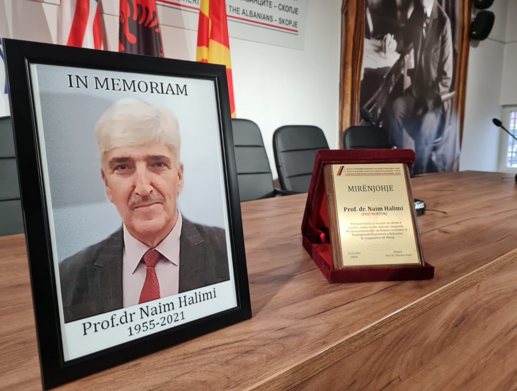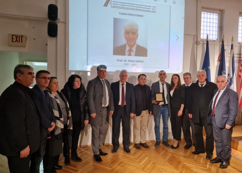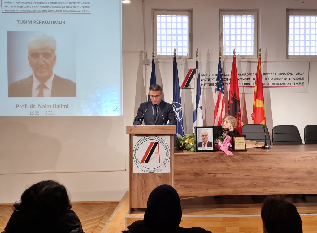 Në emër të familjes, të pranishmit i përshëndeti dhe i falënderoi Mirlinda Halimi – e bija e prof. Naim Halimit, inspektore e farmacisë. Ndërsa, drejtori i Instituti, Skender Asani, i ndau Mirënjohje post mortum Prof. dr. Naim Halimit me motivacion: “Për kontributin e veçantë në sferën e arsimit, shkencës dhe kulturës shqiptare. Për konsolidimin dhe zhvillimin e Institutit të Trashëgimisë Shpirtërore e Kulturore të Shqiptarëve në Shkup”. Plaketën e mirënjohjes e pranoi i biri Jeton Halimi – magjistër i historisë.