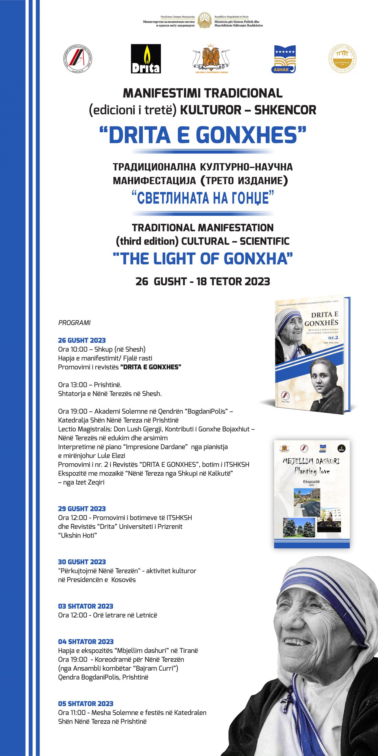 Në prag të Edicionit të tretë të manifestimit, tashmë tradicional, kulturor-shkencor “Drita e Gonxhes”, i cili përkon me 113 vjetorin e lindjes dhe 26 vjetorin e vdekjes së Nënës Terezë, kemi nderin të ndajmë me ju programin e aktiviteteve të parashikuara nga 26 gushti deri më 5 shtator.
